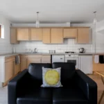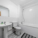 Head in through your private entrance and you’ll find the open plan living room/dining area and kitchen on the ground floor. All the appliances you’re likely to need will be ready and waiting for you in the kitchen. That includes a washing machine. Twin sofas in the adjacent lounge area give you somewhere to kick back and relax. Take the opportunity to look out into your private garden which you access through patio doors. You’re sure to find having some outside space all to yourselves a real bonus.